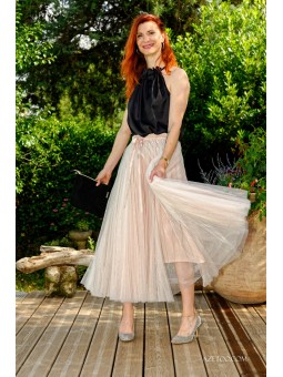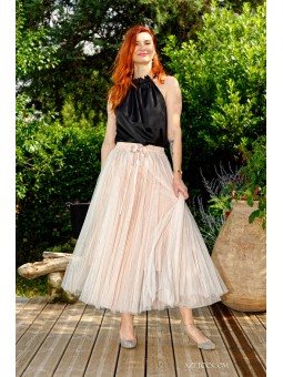 . Jupe Longue en tulle, plissée et ceinturée avec un ruban en satin